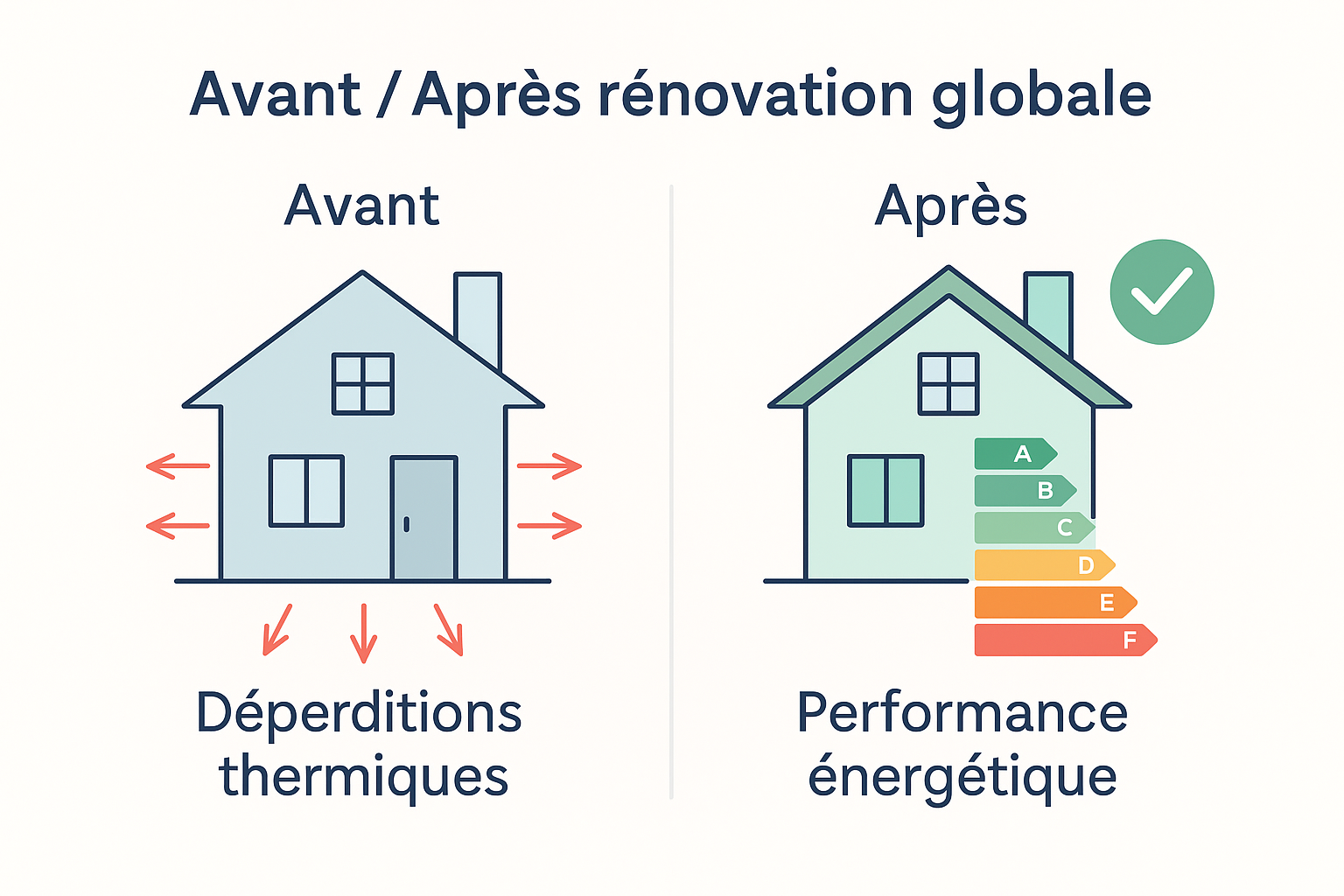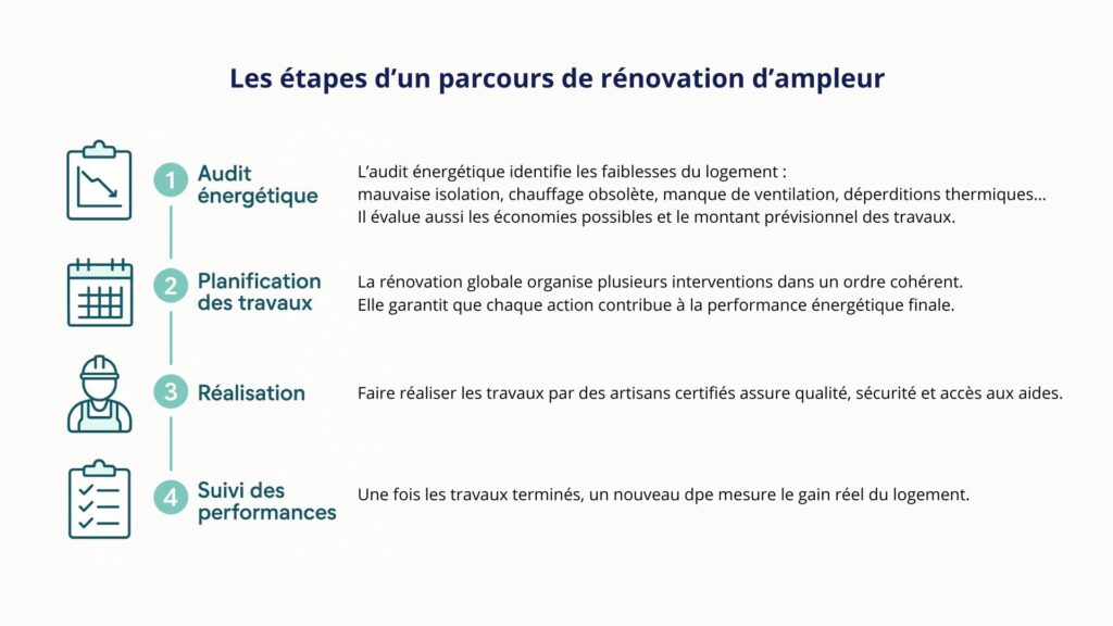 Une rénovation d’ampleur correspond à un projet complet visant une transformation profonde de la performance énergétique du logement. Contrairement à de simples travaux partiels, elle repose sur une approche globale, où l’isolation, le chauffage, la ventilation, les menuiseries et la production d’énergie renouvelable sont traités dans un même parcours cohérent.